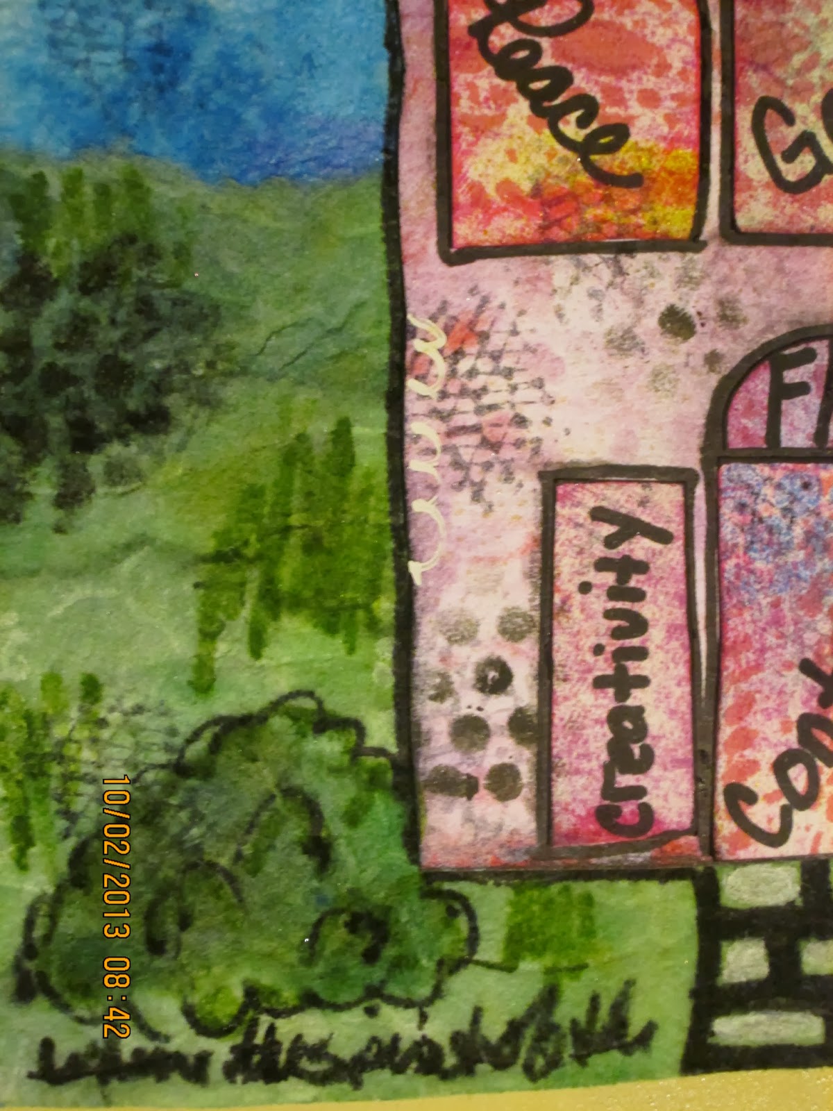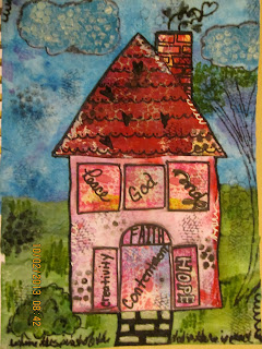 I used sequin waste and shelf liner for stamp texture. Notice that my tree was an after thought and I had already done my cloud. I may put some leaves there later. lol I did a little doodling and that made it fun. The roof is from the paint roll off when I was playing with my gelli plate.